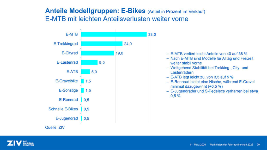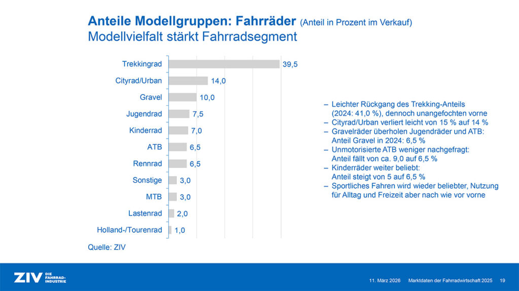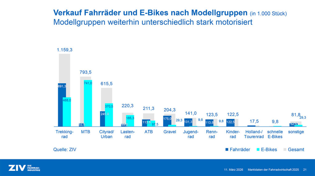 Jedes Jahr im März präsentiert der ZIV – Die Fahrradindustrie Daten zur Entwicklung des deutschen Fahrradmarktes. Dazu gehören Zahlen zu Produktion, Import/Export und Verkauf. Seit den Marktdaten für das Jahr 2015 schlüsselt der Verband E-Lastenräder als eigene Modellgruppe aus. In der Präsentation 2020 wurden erstmals separate Angaben zu Lastenradverkäufen ohne E-Unterstützung gemacht (Zahlen rückwirkend bis ins Verkaufsjahr 2018). Das Wichtigste der Marktdaten 2025 in Kürze: