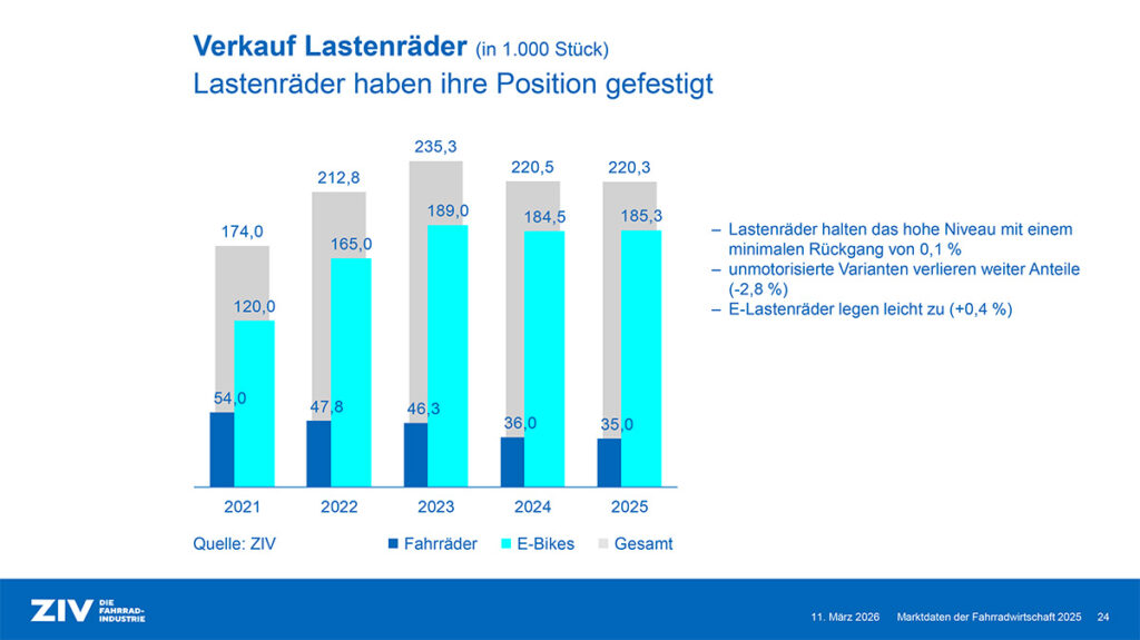 Am Mittwoch stellte der ZIV – Die Fahrradindustrie die Marktdaten der Branche für das Geschäftsjahr 2025 vor. Während die Zahl der insgesamt verkauften Lastenräder im Vergleich zum Vorjahr minimal sank, so stieg sie bei den E-Lastenrädern wiederum leicht an – und knackte dort die Millionen-Marke.