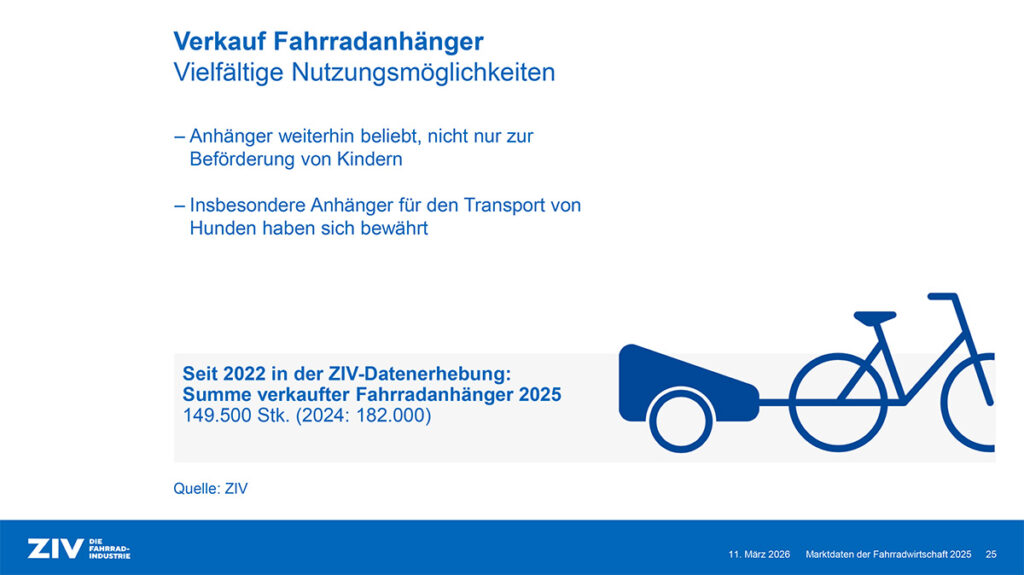 Rückläufig sind wiederum die Zahlen bei den Fahrradanhängern. Seit 2022 (293.000) hat sich der Wert fast halbiert. Da es bei den Anhängern allerdings einen riesigen Gebrauchtmarkt gibt, den die Zahlen des ZIV nicht mit abdecken, muss der Trend nicht erschrecken. Fahrradanhänger bleiben weiterhin eine beliebte Beförderungsmöglichkeit für Kinder und Hunde.